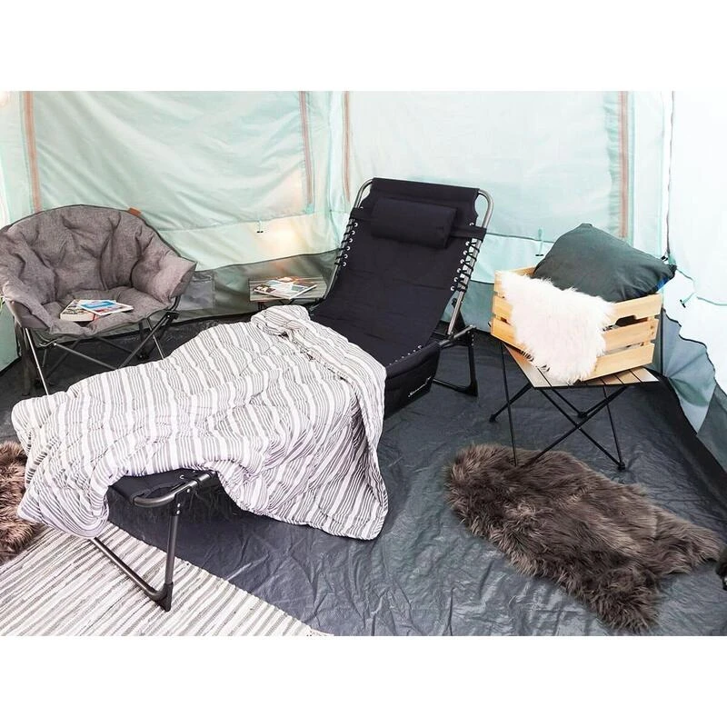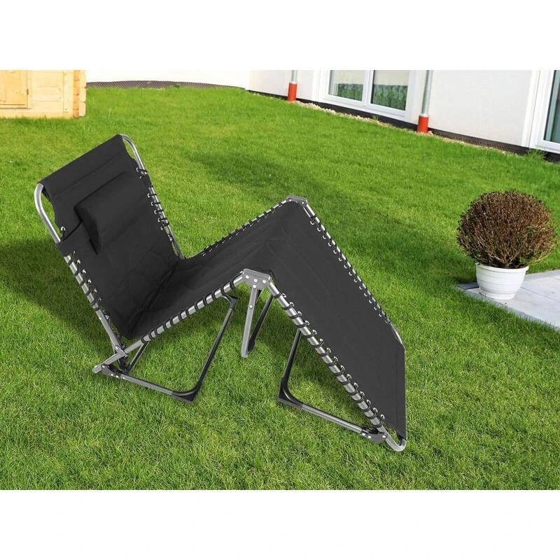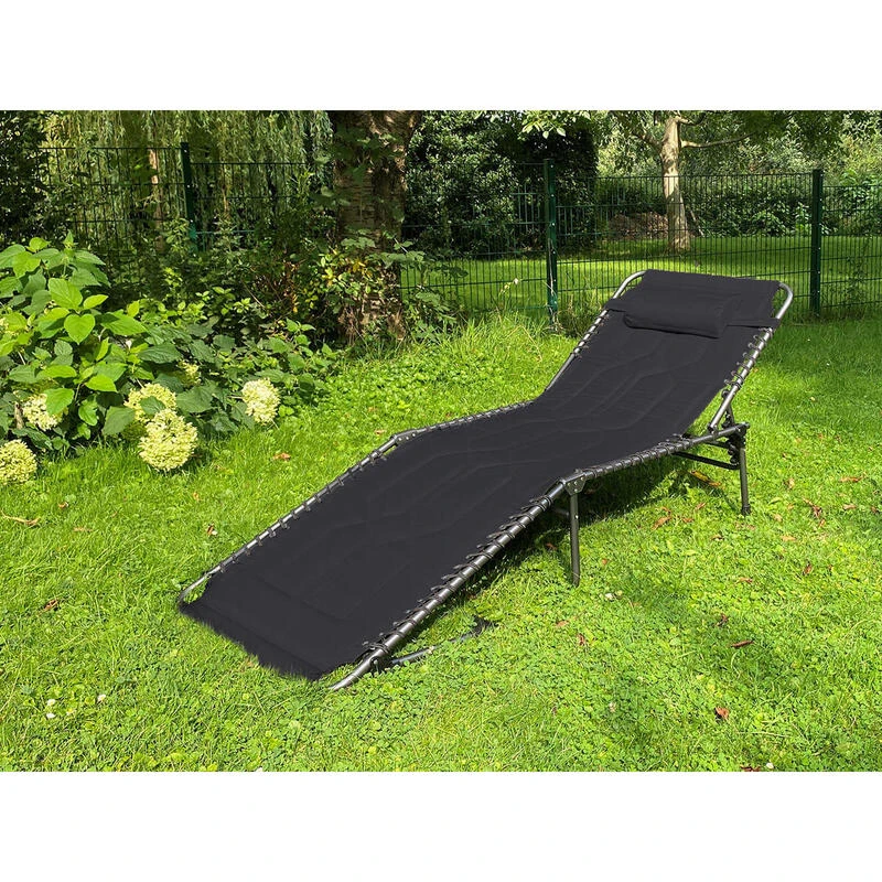 Chaise longue transat de camping pliable, rembourrée, réglable en 5 positions, appui-tête réglable, supporte max. 150 kg, hydrofuge, cadre en acier, coussin de tête amovible