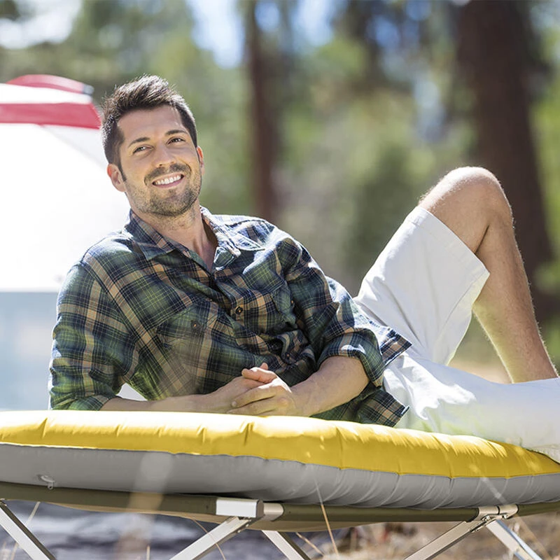 Solution de sommeil parfaite pour le campingLit conçu pour entrer dans une tenteMatelas léger portableSurface de couchage confortableIncluant sac de rangementDimensions : 183 x 76 x 10 cm